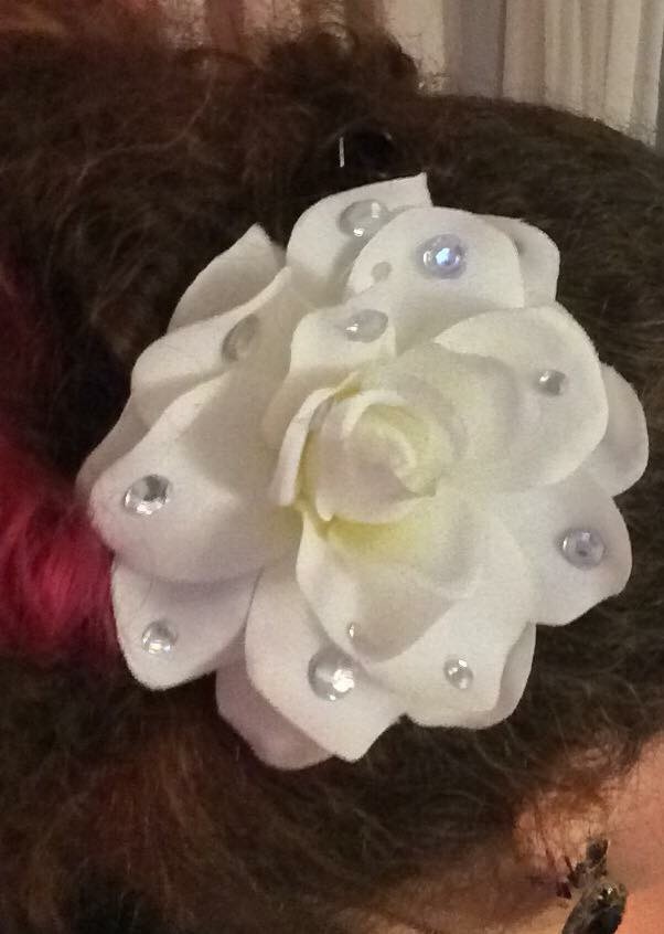 So I cut the stem off of the flower and hot glue it to a hair clip. Any type of hair clip will work. It’s up to you what to use based on what kind stays in your hair best. Pretty much anything stays in my crazy frizzy hair but you may need more of a clip that closes well around your hair. Then I hot glue the bejewels on random petals and you’re done!