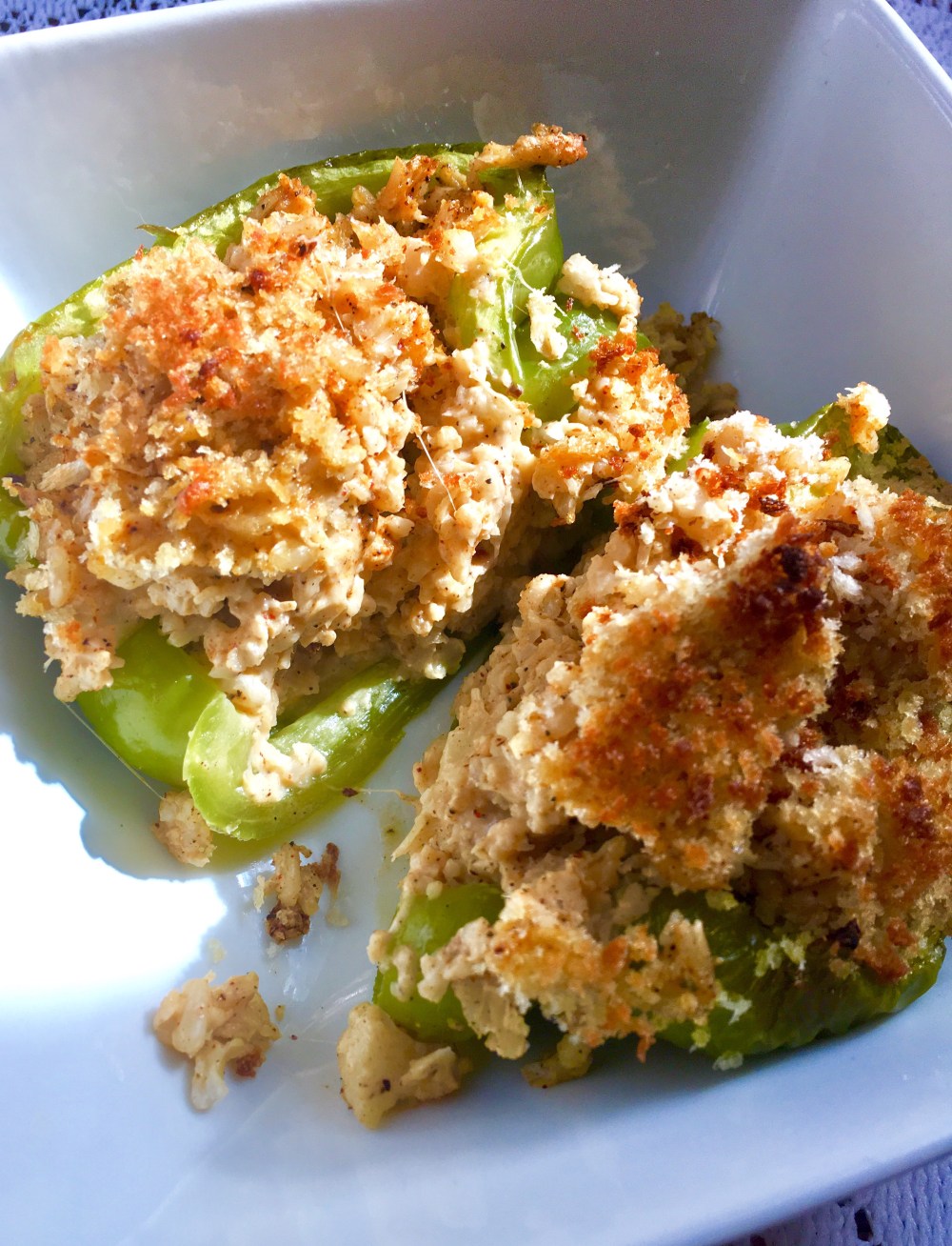 - When peppers are done, fill with cauliflower rice mixture and top with bread crumbs.