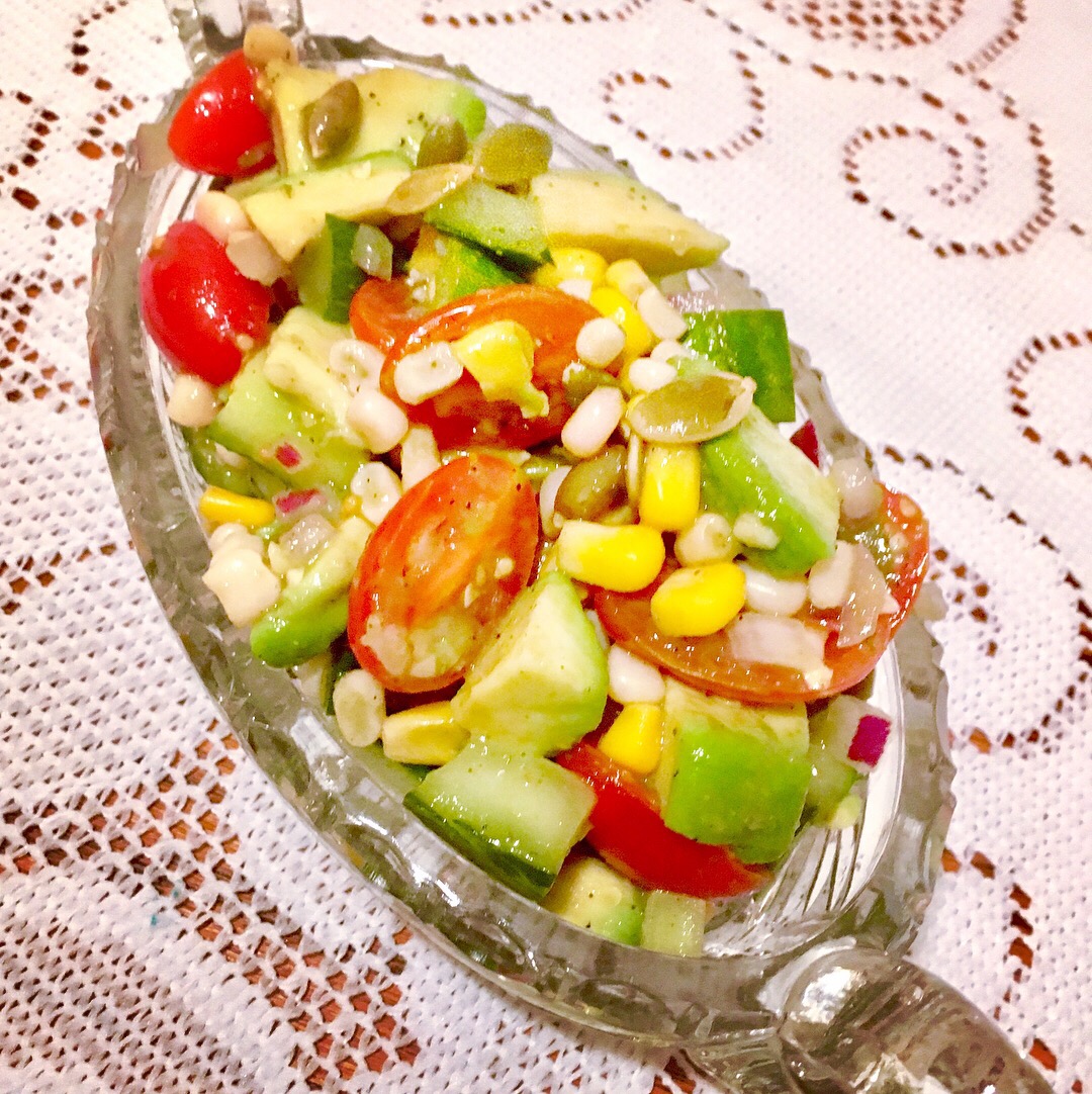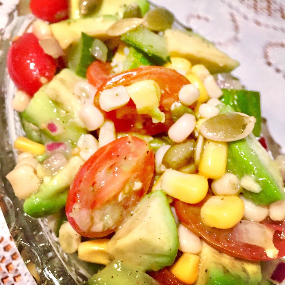 My fiancé’s mom requested a summer veggie salad for their vow renewal. She had had something she really liked at a Church event of hers. She named off some of the ingredients and I went full on creativity!