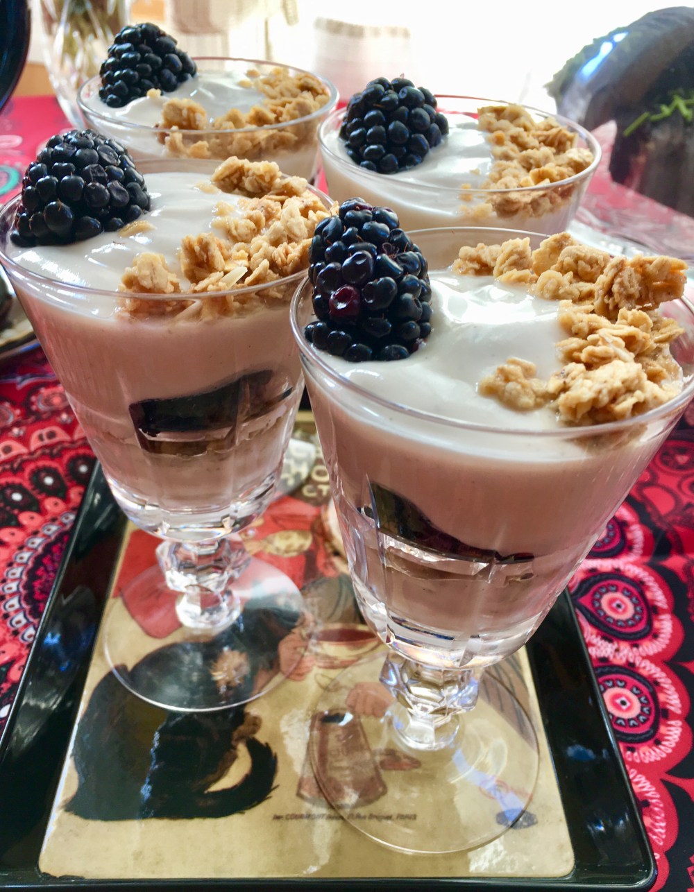 So, these Parfaits….all I did was so two layers. Spoon some yogurt on the bottom, then add a thin layer of your favorite granola mix. Then add blackberries. Spoon in more yogurt, then top with granola and blackberries. Booyah!
