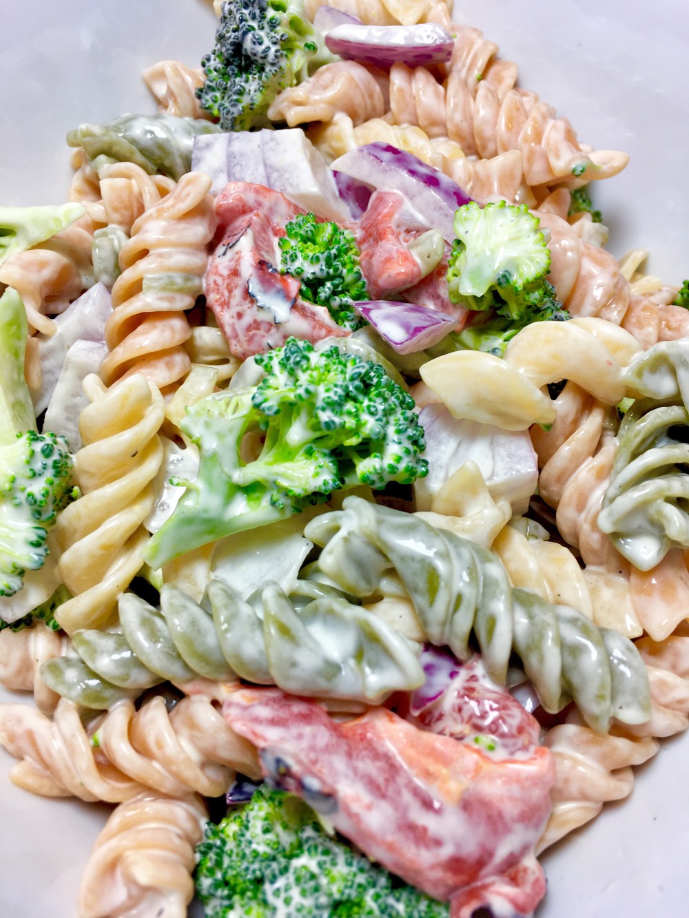 The best thing about pasta salad is that you can do whatever type of noodle you want, whatever type of vegetables you want and so much more! You just need a good base.