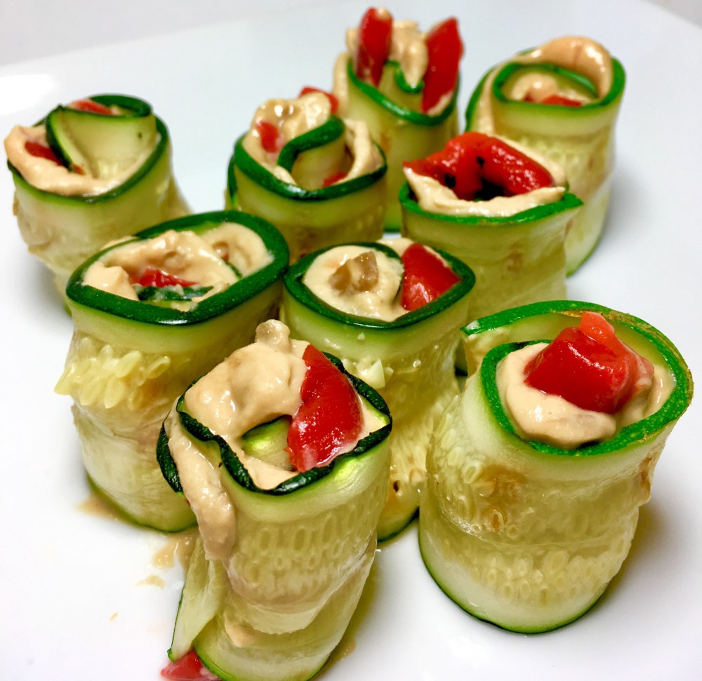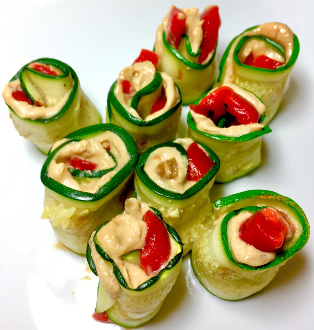 5. Put a couple diced roasted red peppers (or any other veg of your choice, sun dried tomatoes might be bomb too) on the zucchs.