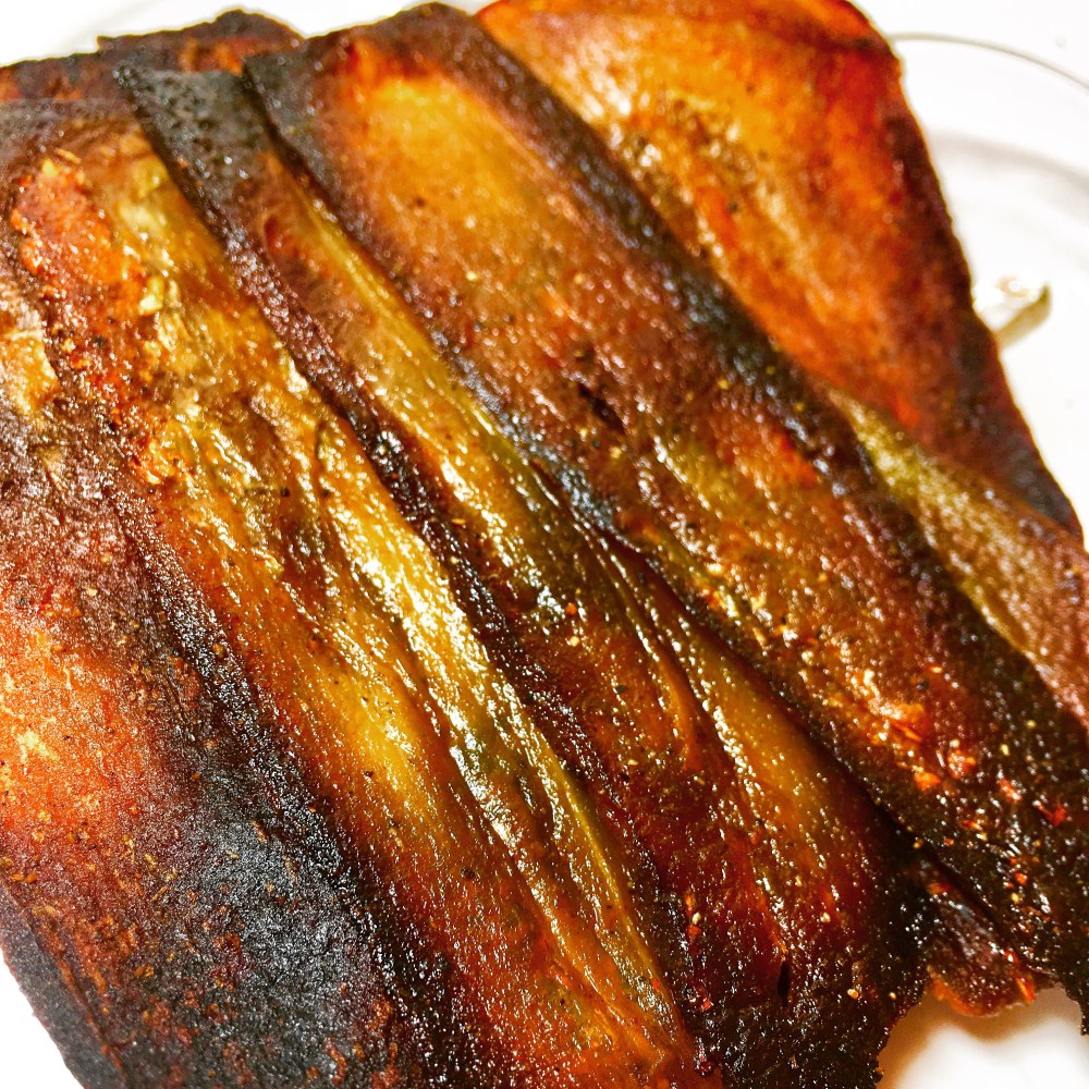 - Bake for about 45-60 minutes, flipping half way. Keep an eye on your ‘bacon’ to make sure you’re not burning it. You want them to be thin and slightly crisp. But I will say that they actually get much more crispy once they have cooled.