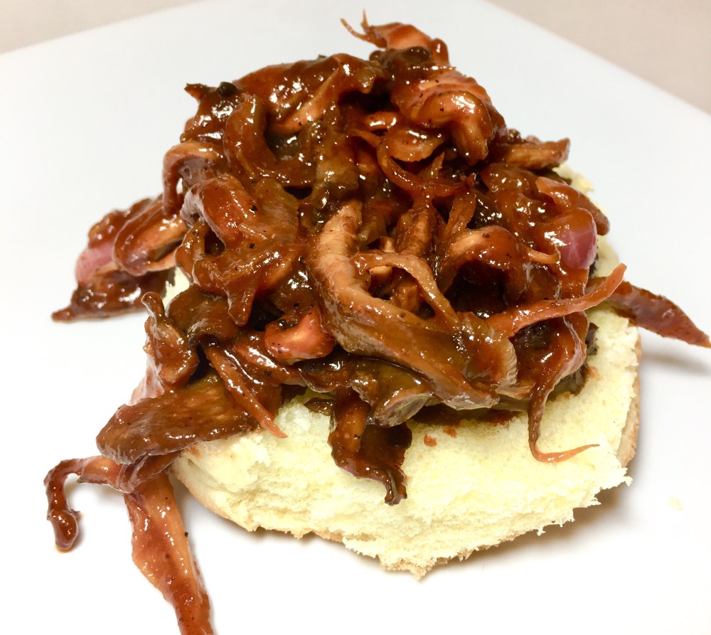 - When your shrooms are done, put them in the sauté pan with your onions and add your bbq sauce.