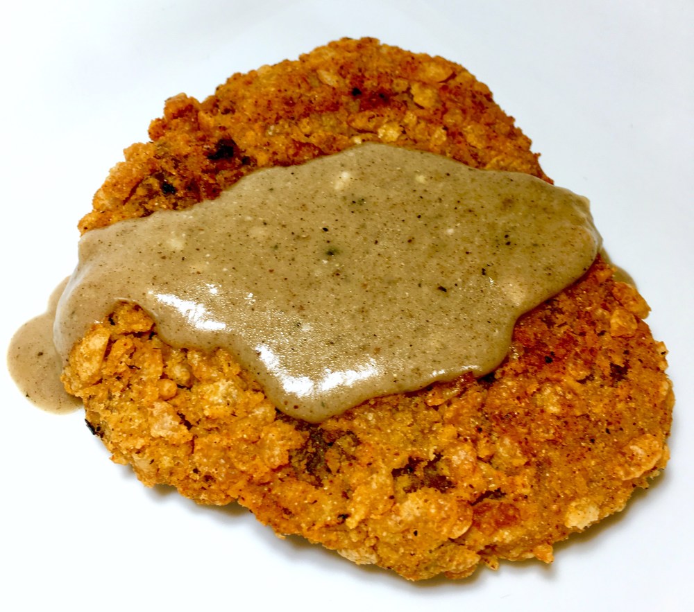 - Dip the floured ‘steaks’ into the ‘egg’ mixture of chickpea flour and water and then into the crispy rice cereal chickpea flour mixture.