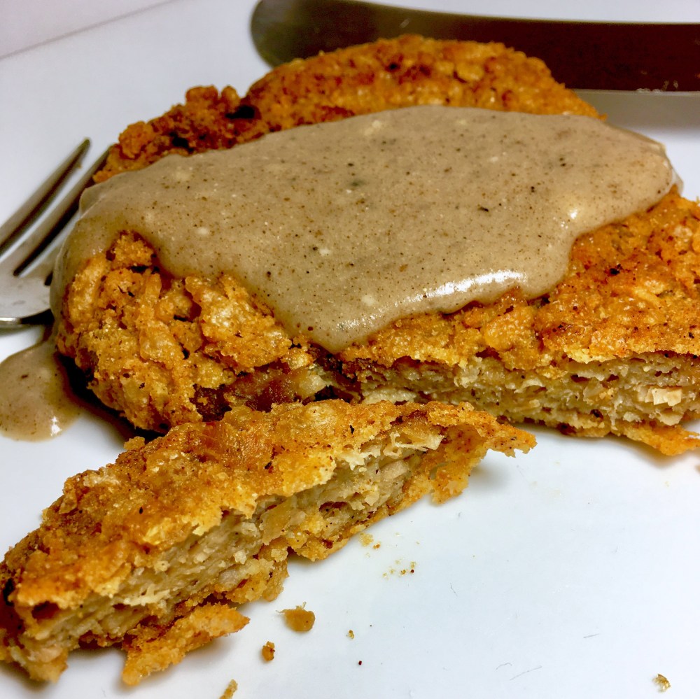 - In a preheated cast iron pan of vegetable oil, shallow fry the ‘steaks’ in batches until done.