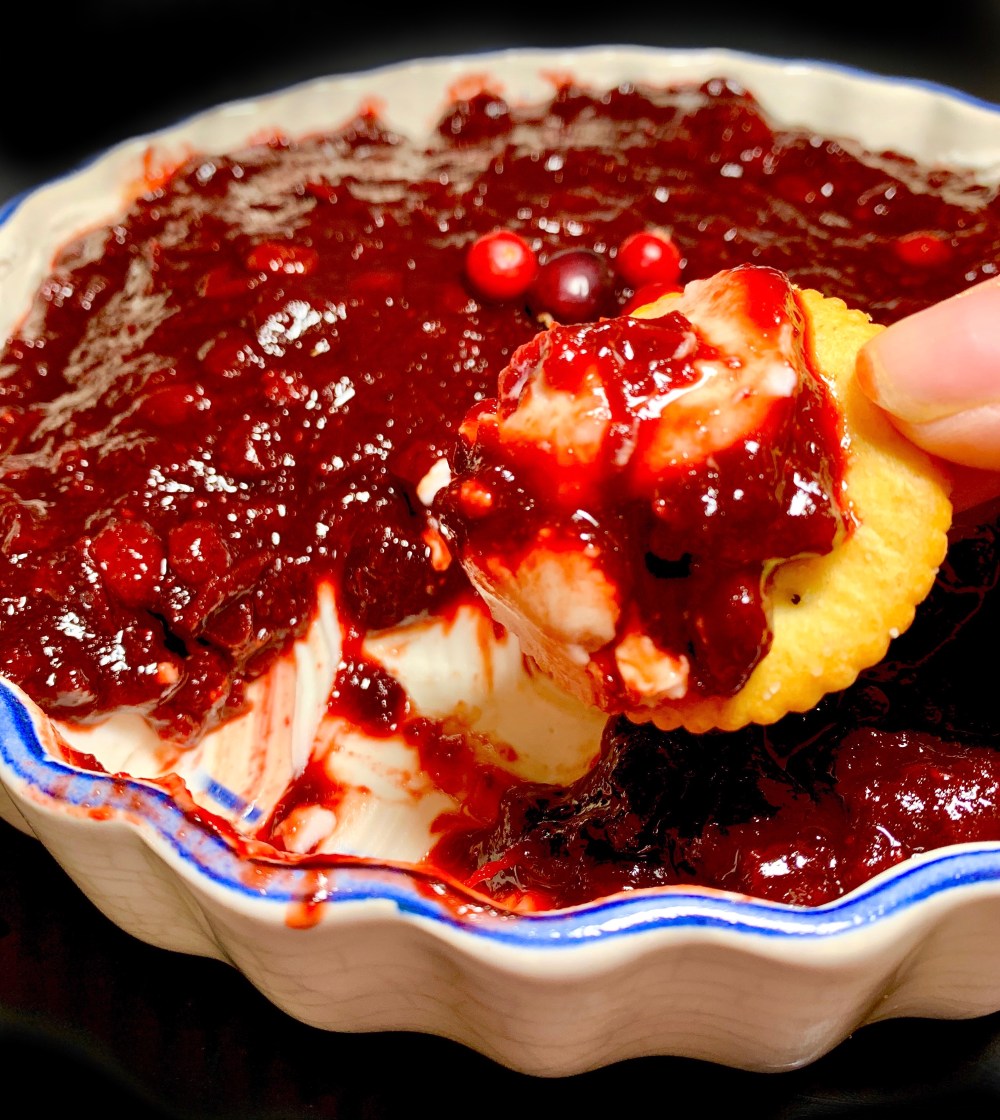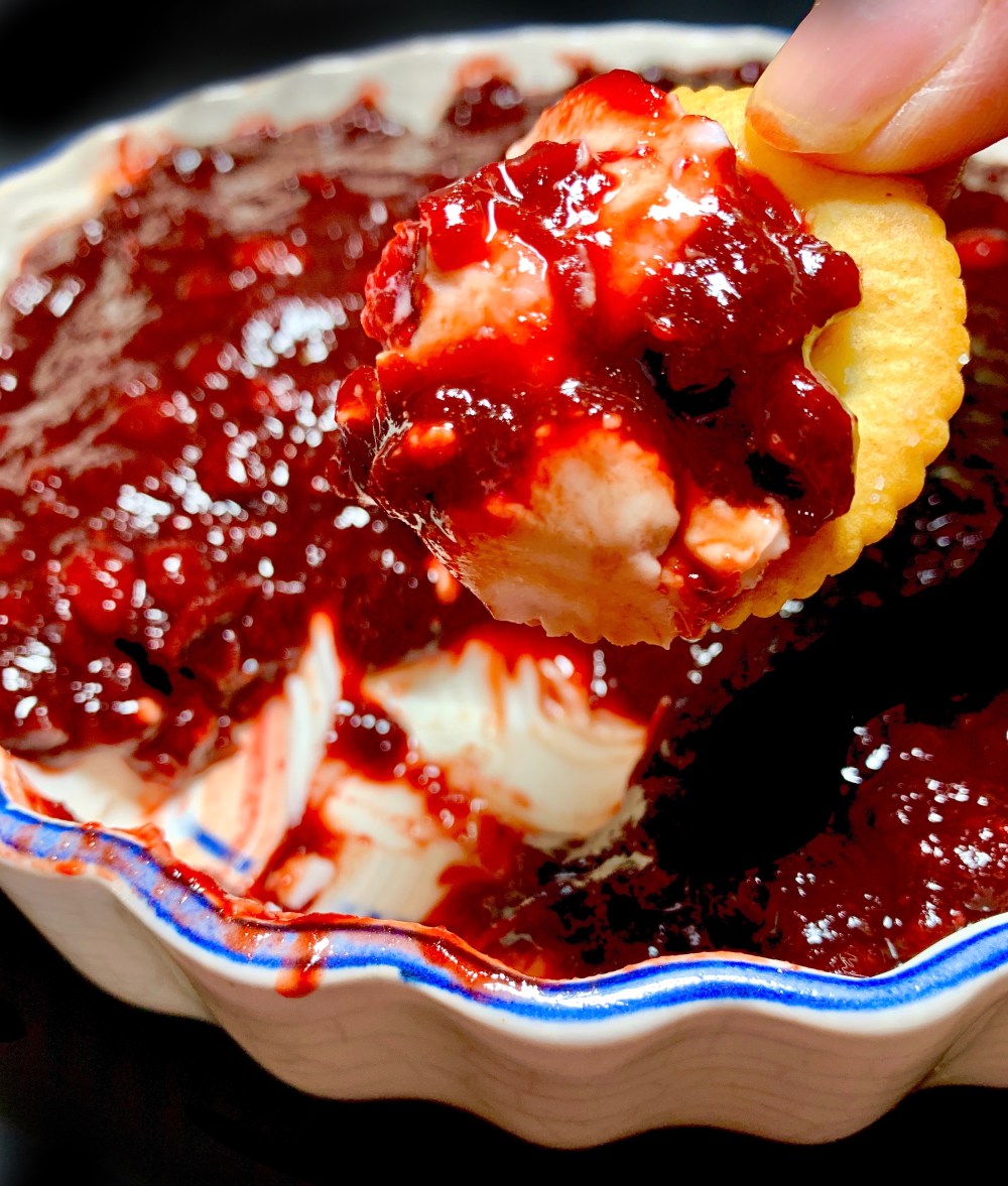 - In a shallow dish, spread the vegan cream cheese and then pour on the cooked ancho cranberry sauce. Serve cold with crackers or a baguette.