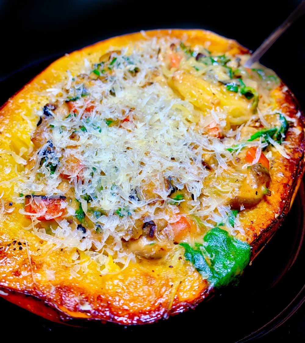 - Once the squash is done, shred just a bit of the middle but not all of it and keep in the skin. Add the filling to each and top with more vegan parm. Bake again in a 350°F oven for just about 8 minutes to melt the top cheese a bit.