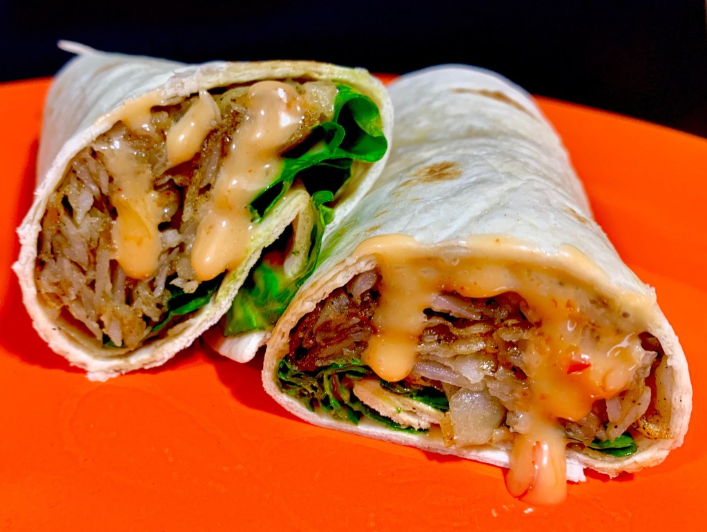 - Fill tortillas with hash browns, spinach and bang bang sauce.