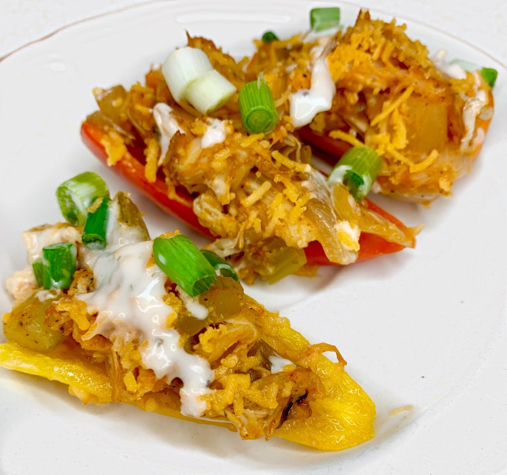 Stuffed peppers have never been my fave so I figured let’s jazz it up with some Buffalo chikin dip esq kind of thing…jackfruit is PERFECT for such a thing! I’m so glad I found it!