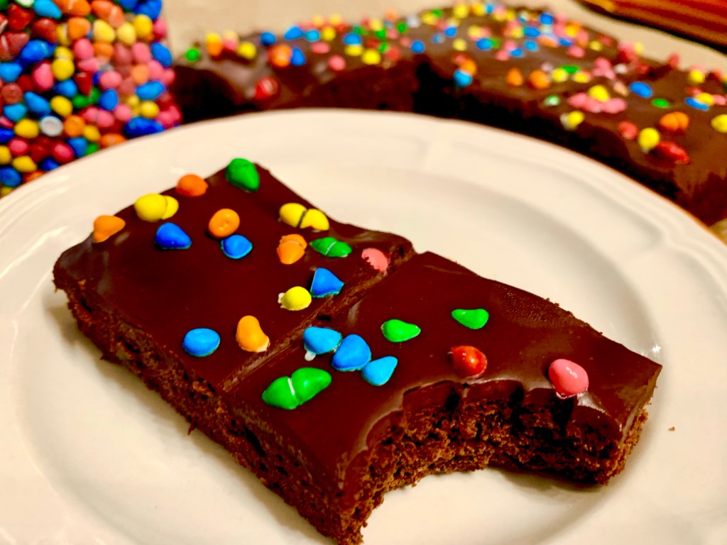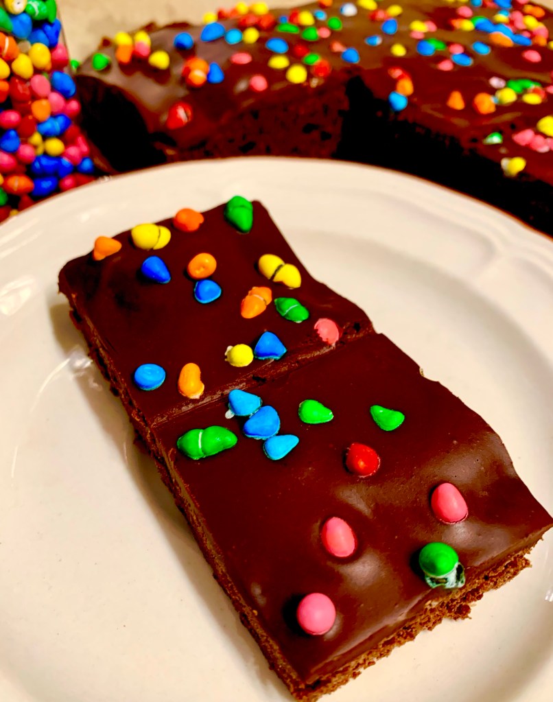 - Once cooled, microwave the oat milk and chocolate chips in a small bowl until just melted and pour over top of the brownies and sprinkle the rainbow chips