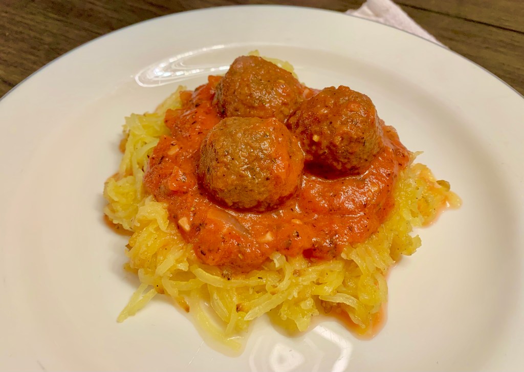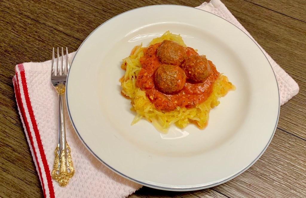 I loved mixing red sauce and white sauce with pasta when I was in college! So let’s make it a bit healthier today with spaghetti squash instead of box pasta and a random pink sauce using the ingredients I have on hand!