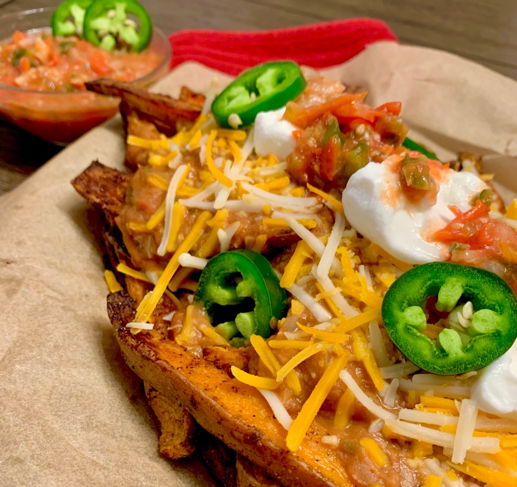 Once those are done, add some salsa to some vegan refried beans and cover fries. Add vegan cheese and put back in the oven until cheese is melted and warmed through