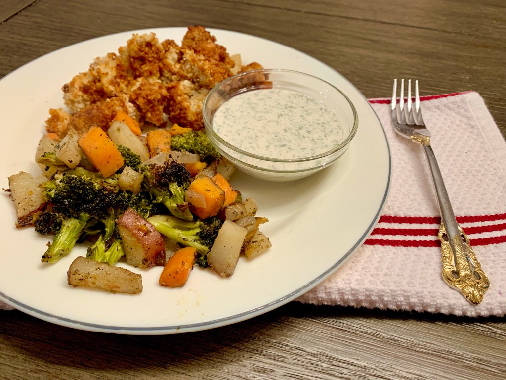 I just wanted to try this salt free hot wing sauce I found and then this dinner evolved to what it is now! I made a Buffalo style sauce with it and then made cauliflower hot wings with roasted veg and a random vegan ranch I threw together!
