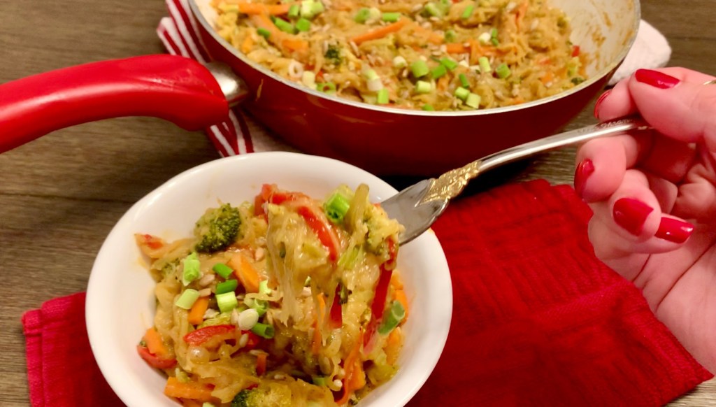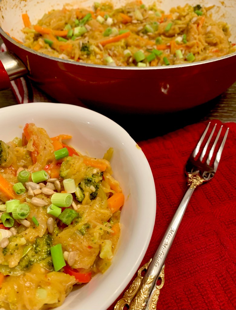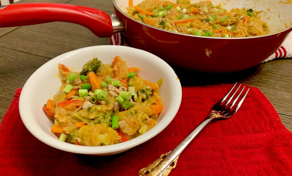While the squash is cooking, sauté some veggies, I used 2 carrots, 3 celery, 1 onion, 1 bunch of broccoli and 1 red pepper. Add 1/2 tsp black pepper, red chili pepper flakes and 1/4 tsp ground ginger. Once they’re about done, add a couple tbsp of minced garlic. Toss in spaghetti squash and Thai peanut sauce.