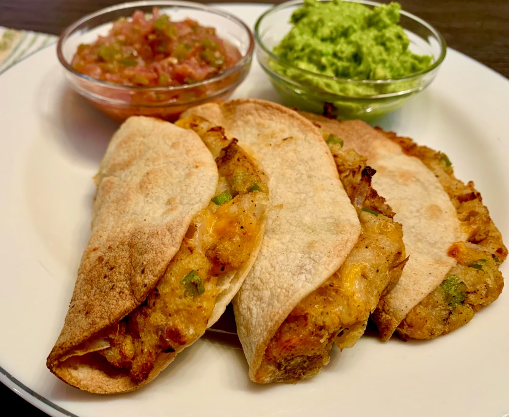 Add some chili powder, cumin, paprika, red pepper chili flakes (and garlic powder, onion powder and black pepper too if it’s not already in your potatoes) into your mashed potatoes. Add some diced onion and green pepper and some cheese of your choosing. Warm up some corn tortillas so they’re more pliable and then schmear the potato mixture in half and fold over. Spray with some Pamela on both sides and Air fry on 400°F for about 12 minutes.