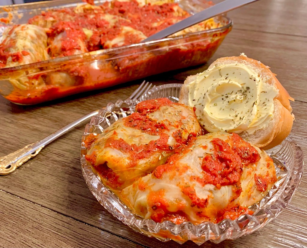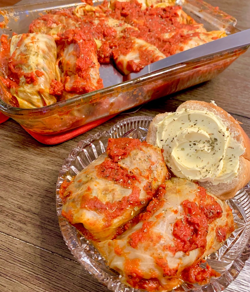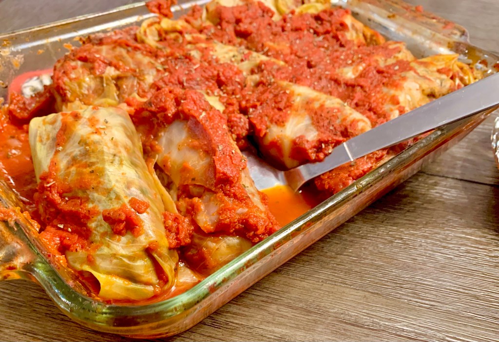 - Fill each cabbage leaf with the rice and beans mix, roll up and place in the sauce that’s in the pan. Repeat until the pan if full and you’re out of leaves then pour the rest of the soup mix on top