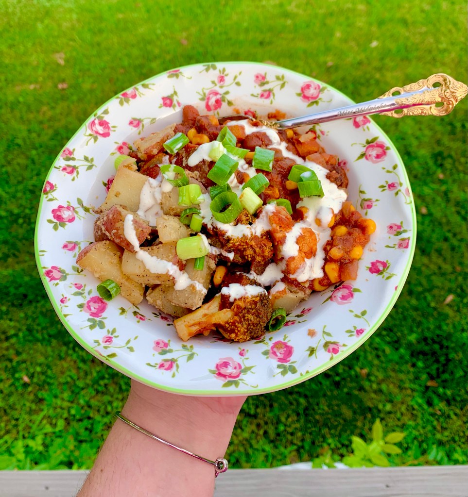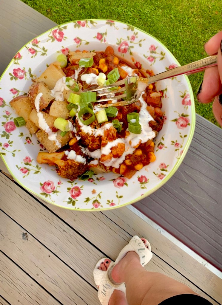 I put the chili on my potatoes and topped with a little vegan sour cream and green onion