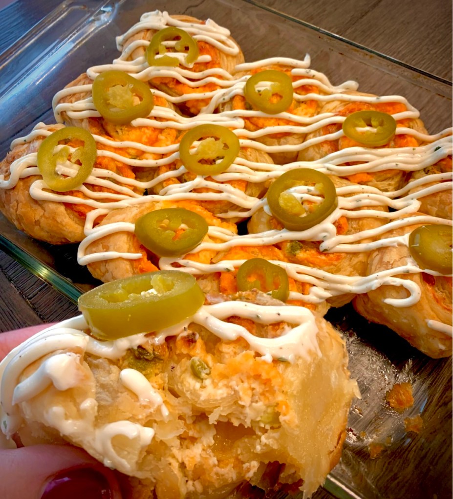 I mean, just look at how poofy and delicious they look! The ranch icing is certainly optional but I think it gave it that extra fun and scrumptious play I was looking for. Meat eaters can add bacon, vegans can use their favorite non dairy replacements. People who don’t like spicy can use less jalapeños or even pimentos for a southern cheese roll puff vibe! You do you babes!