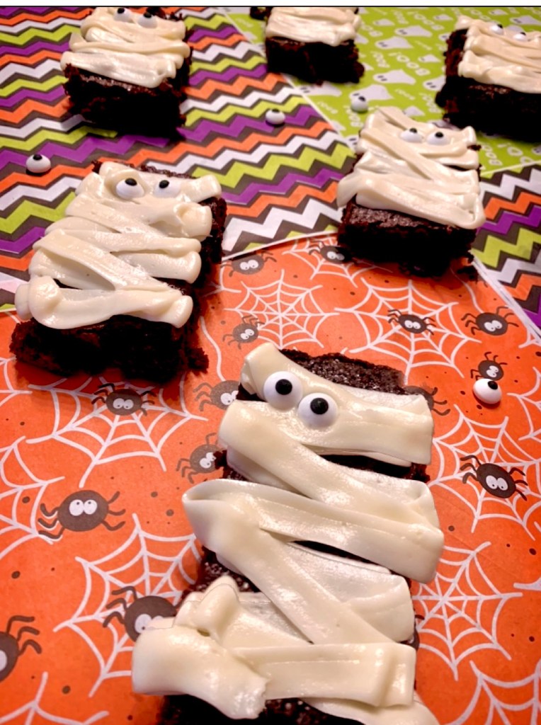 3. Pipe zig zags on the brownies to look like a mummy and then add eye balls wherever you feel like they should go