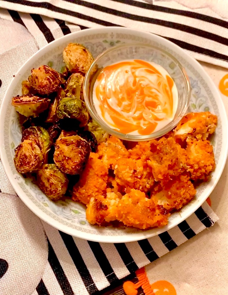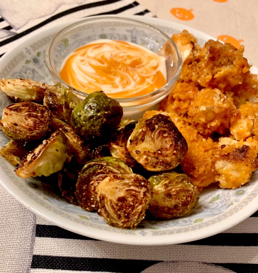 I love baked breaded cauliflower with sauces! I also love roasted Brussels sprouts, so it’s an easy way to get a ton of veggies for a fairly healthy weeknight dinner that really just requires cooking time but the prep is easy peasy!