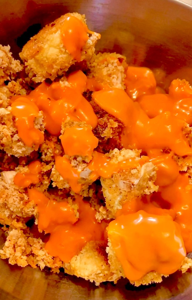 If you’re making this vegan, franks Buffalo sauce is accidentally vegan so that’s pretty dope!
