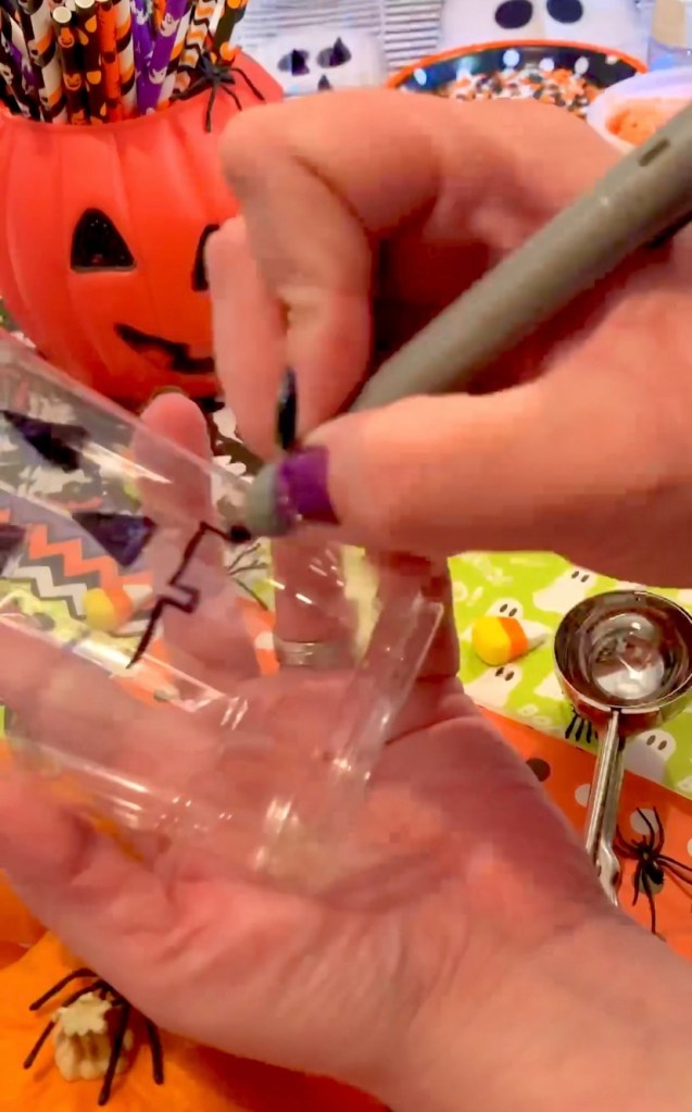 The cups are just regular clear plastic cups and then I used black permanent marker to draw a face. You can certainly do any fun pumpkin faces your heart chooses. Each guest can draw their own maybe for like funsies!