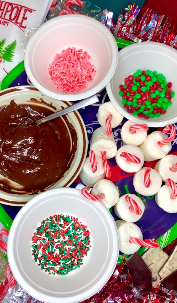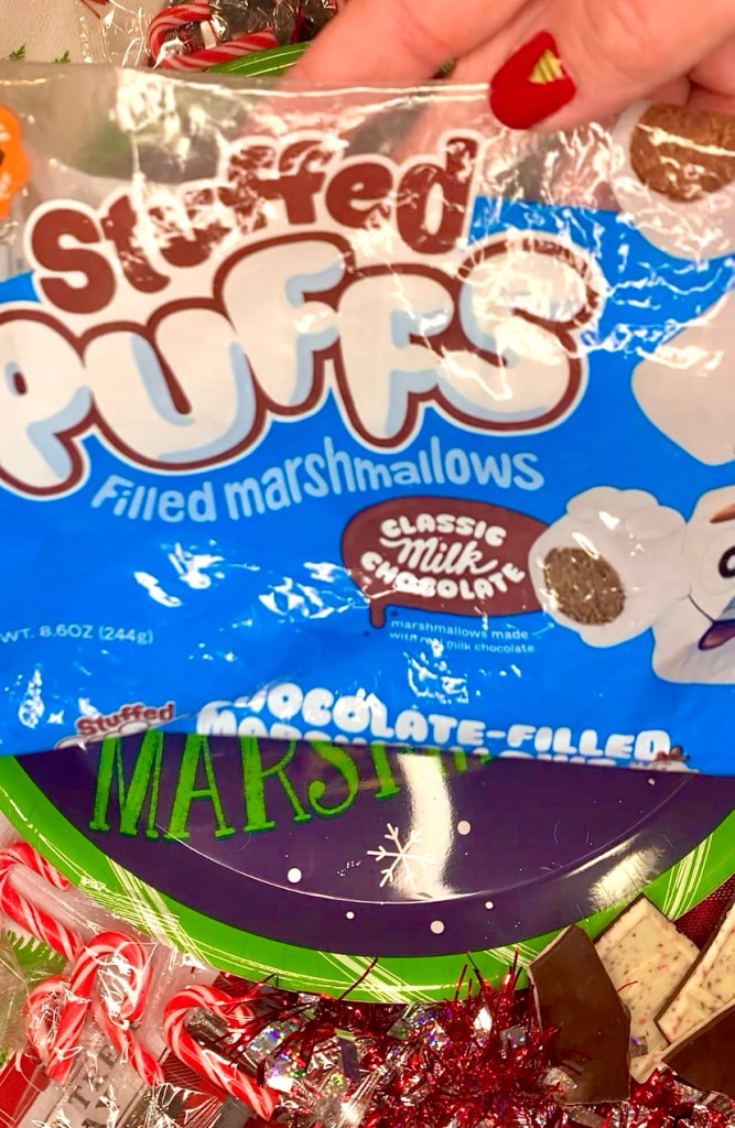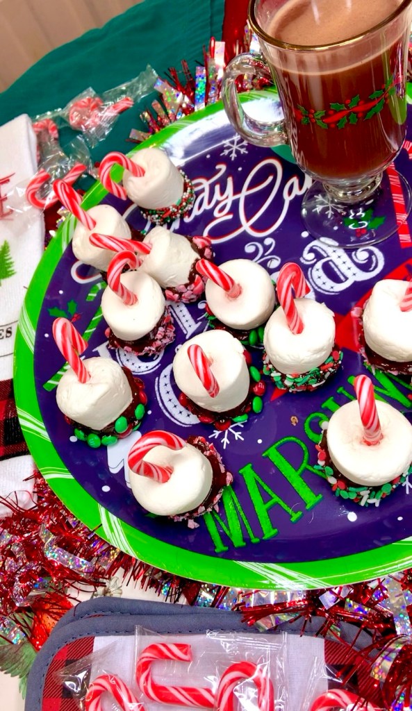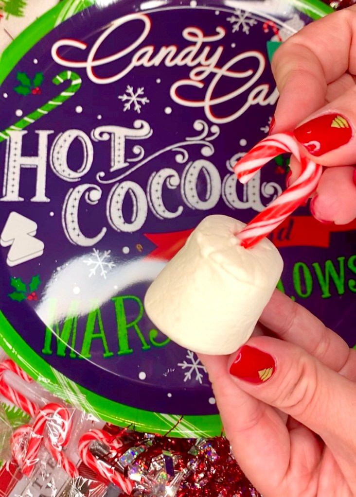 Despite there being a huge hunk of chocolate inside the mallows, there was still enough space to shove a mini candy cane inside! I just got them at the dollar store.