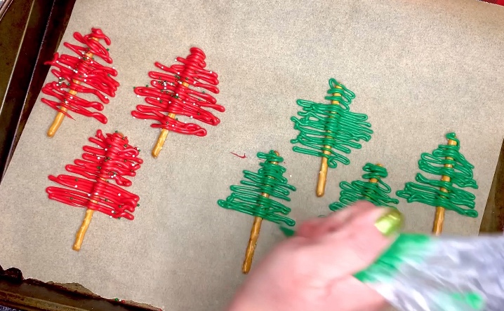 - Make the pretzels by melting the chocolate and making trees on top of your pretzels sticks on some parchment paper, add sprinkles as ornaments and let set before removing