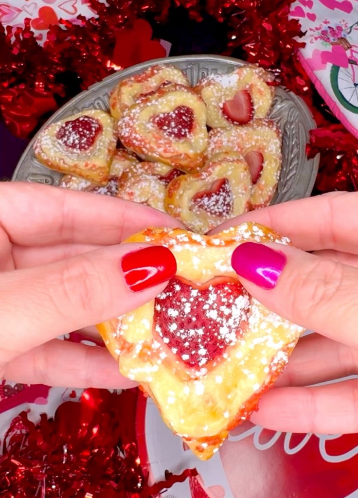- Then add the cream cheese danish filling to the center hearts and top with chopped strawberries or one heart strawberry