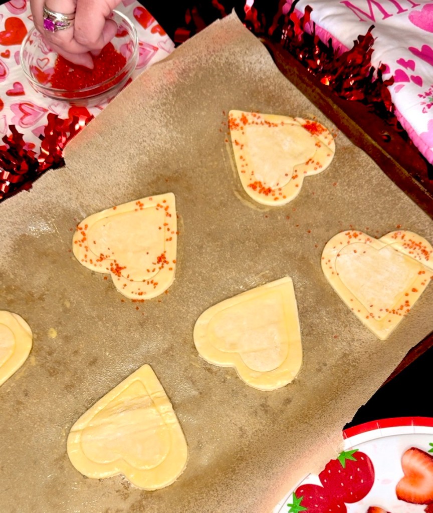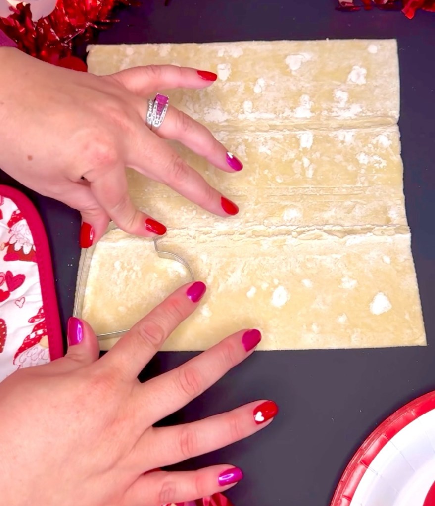 - Cut out hearts of puff pastry and then use a smaller heart to make an indentation for the edges to puff up