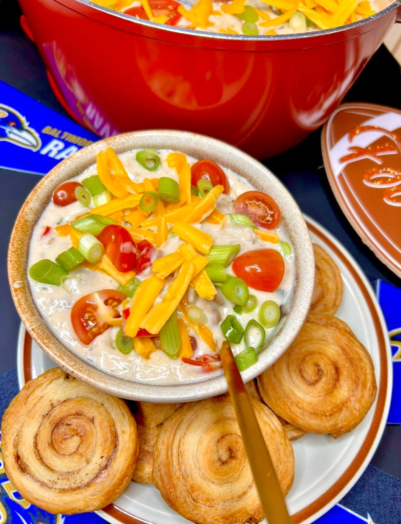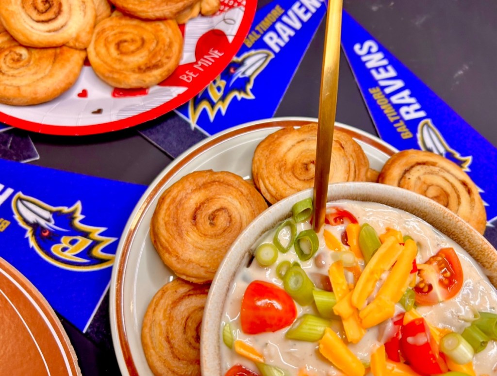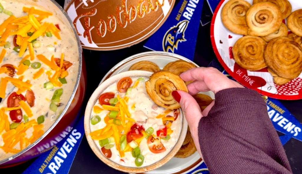 Either way, I think you’ll LOVE this Maryland blue crab white chili and cinnamon roll chips recipe for chiefs and ravens football game day this Sunday!