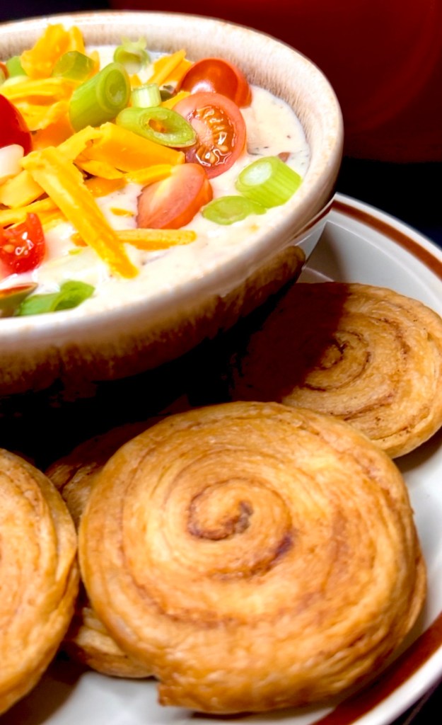 You can certainly dip the cinnamon roll chips into the Maryland blue crab white chili like I did, but I was thinking maybe with the leftovers I will just pour it over like creamy crab nachos!