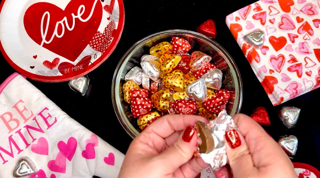 The chocolate candy hearts for the easy sugar cookies and the Valentine’s Day decor was brought to you by the Dollar Tree!