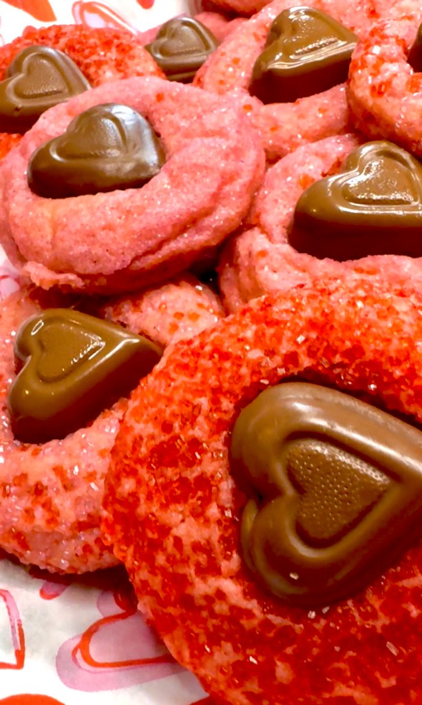 Just look at how beautiful these Valentine’s Day sugar cookies are with the heart shaped chocolates!