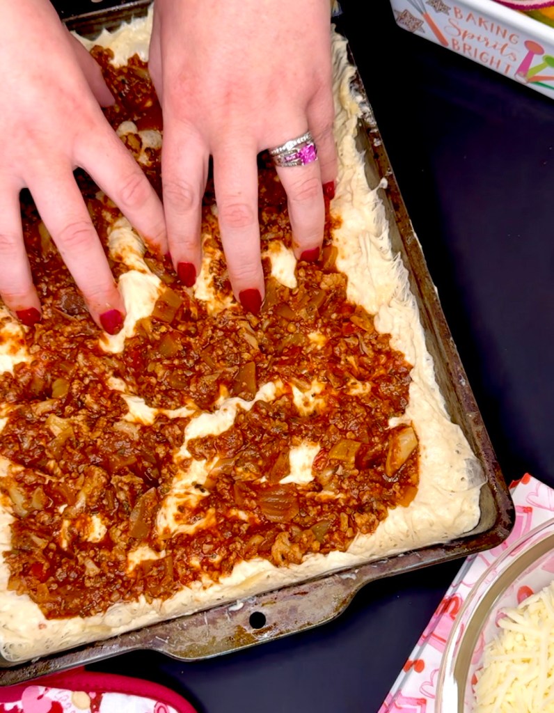 I used my Cauliflower Bolognese for this focaccia pizza but you can certainly use any sauce of your choosing. Just make sure you’re gentle with spreading it so you don’t bust the airy focaccia dough you just made.