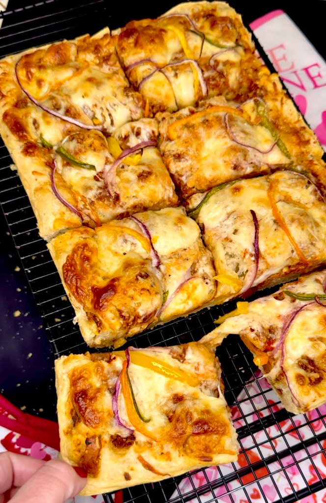 Once your focaccia pizza has cooled for a few minutes, you’ll want to transfer it to a cooling rack so the bottom of your pizza doesn’t get soggy. The easiest way is to use pliers to hold the hot pan and then gently guide it out with a large spatula. You can just use an oven mitt instead of the pliers but baby those pliers make it so easy to hold and less awkward!
