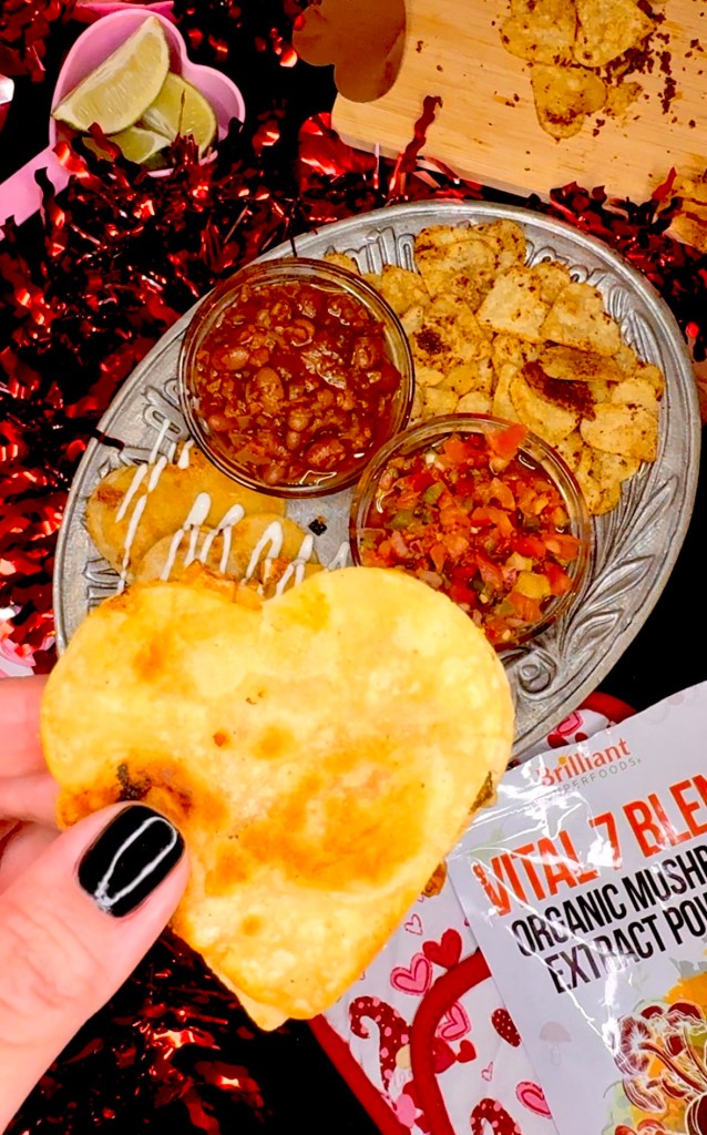 I made some heart shaped nachos on the side, as well because what else are we doing here? And the tortillas I buy come in like an 80 pack for $4 so I need to use them up! That recipe is coming soon too but of course I used Mushroom Powder from Amazon as one of the seasonings because it just has so many positive health benefits and gives extra umami flavor to everything! I’m obsessed!