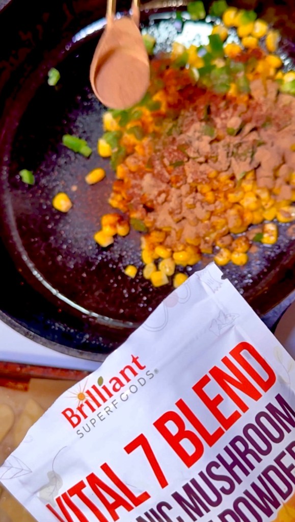 Add 1 cup of corn and 1 diced jalapeño to a pan and sauté with a little oil and some seasonings. I used 1/2 tsp each of chili powder, cumin and Organic Mushroom Powder from Ellie’s Best on Amazon.