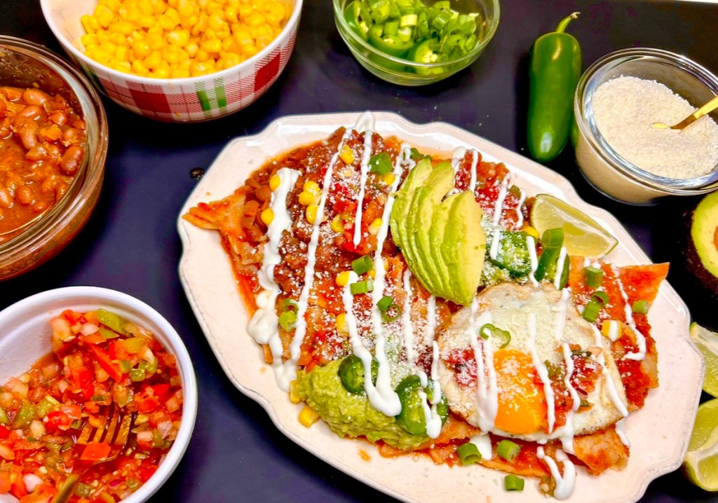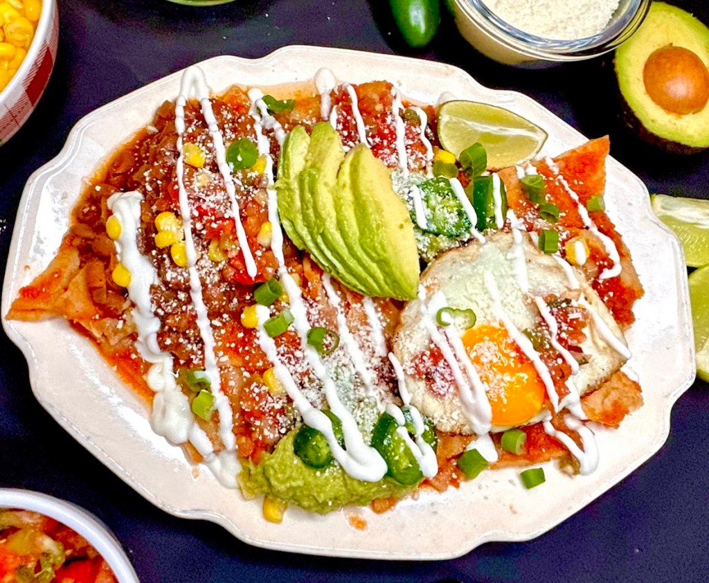 - Plate your chilaquiles and add your sides and toppings! Don’t forget that fresh homemade guacamole and crema drizzle too!