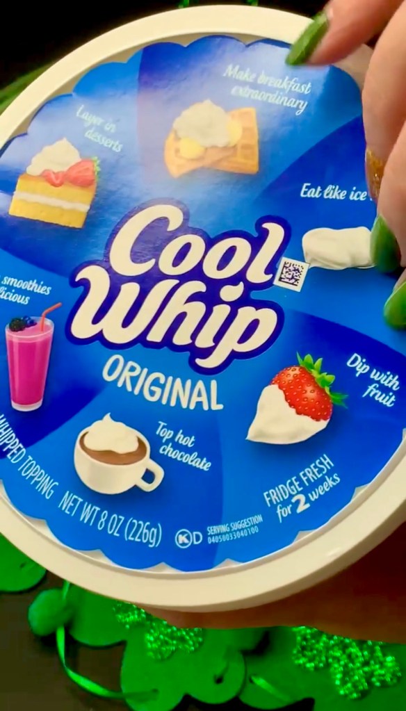 Once your pudding starts to thicken, add an 8oz tub of thawed cool whip. Side note, you could make this sugar free with the appropriate replacements. Jello-O makes sugar free pistachio pudding mix, cool whip makes zero sugar, pillsbury makes zero sugar chocolate frosting…you’d just have to find a sugar free chocolate graham. Worse case you can just do regular sugar free Maria cookies like I did in my Sugar Free Eclair Cake recipe last year.