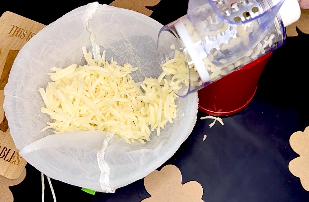 I also used Ellie’s Best Nut Milk Bag from Amazon to squeeze out the extra moisture from the shredded potatoes.
