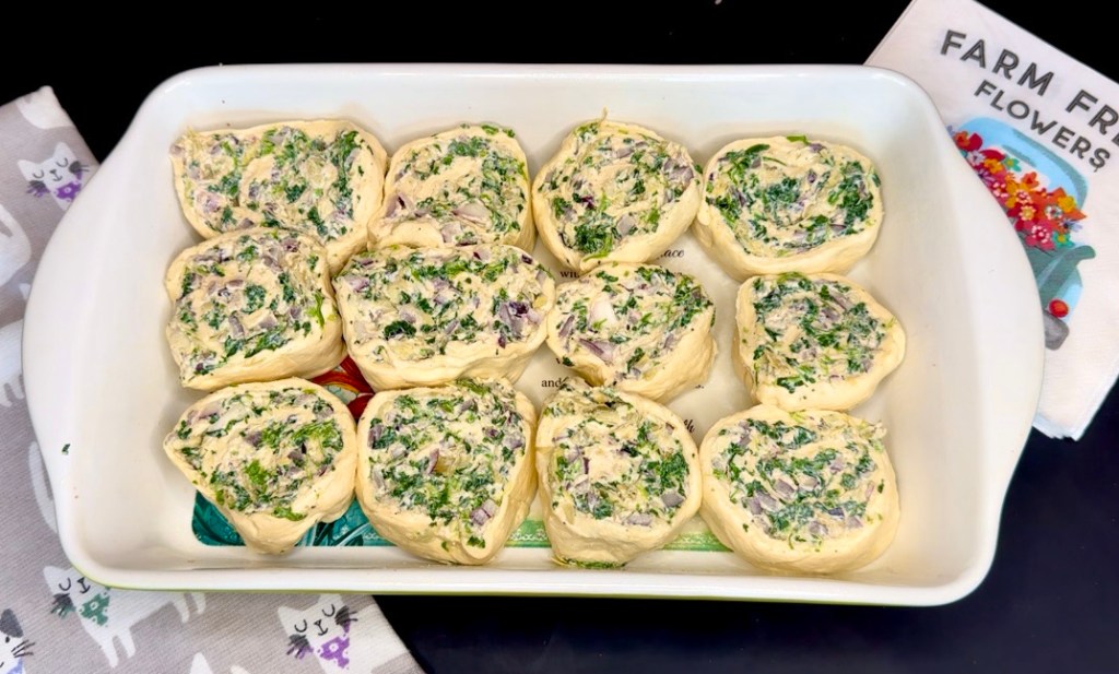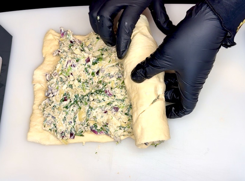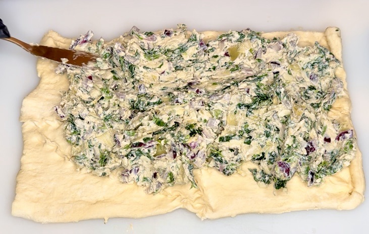 - Roll out the crescent roll dough and spread the spinach artichoke filling, 1/2 of the mixture on each roll