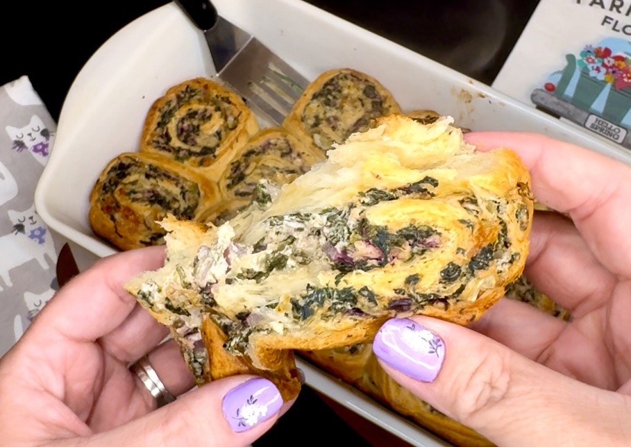 After you make the spinach artichoke dip, you can use it as a filling for all the different things! I’ve used it in puff pastry muffin tins, I’ve used roasted potatoes to dip in it for gluten free friends and I’ve even added it to pasta! It’s so versatile but spreading it on crescent roll dough