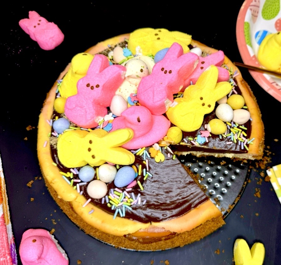 - Pour the ganache on top of your cheesecake and decorate so that your peeps can be adhered in the ganache and let set in the fridge