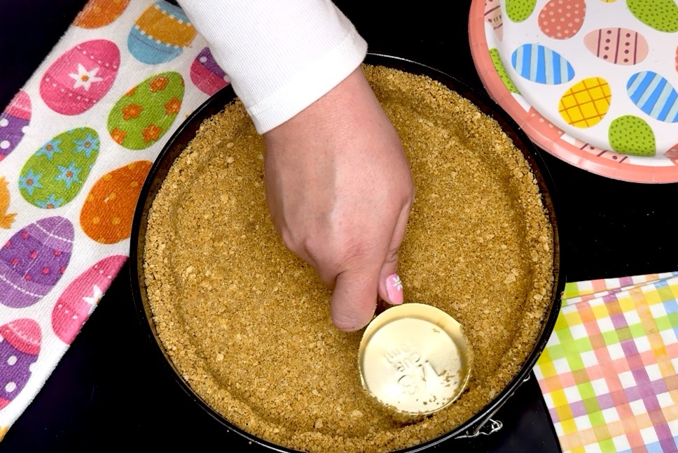 - Mix together the graham cracker crust ingredients and use a 9.5” spring form pan to make your s’mores cheesecake crust. Then bake for 10 minutes and let cool while you make the peeps cheesecake filling