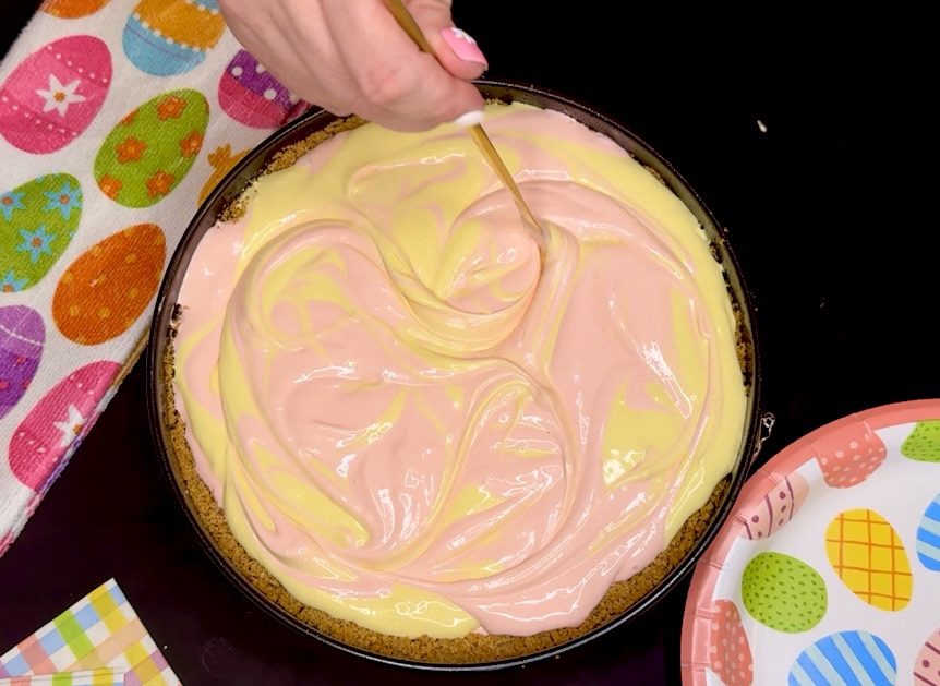 - Then spoon each color, alternatively, into your cooled graham cracker crust and gently swirl with a butter knife…be sure not to go all the way to the crust and then bake for 50 minutes until just set.