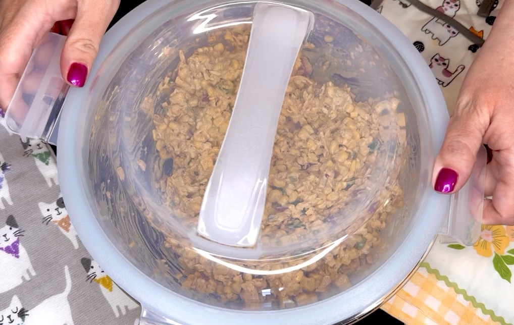 - When ready to serve, crush up a few handfuls of tortilla chips and stir, or crush some up to put on top of each serving or use the corn salad as a dip with the tortilla chips! Dealers choice