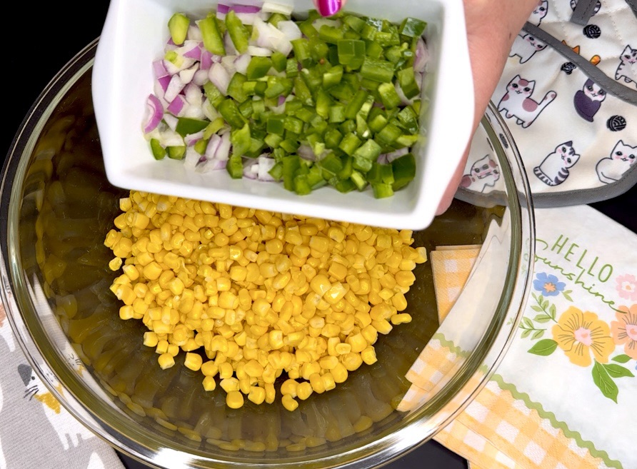 - Drain and rinse corn, then add to a large bowl