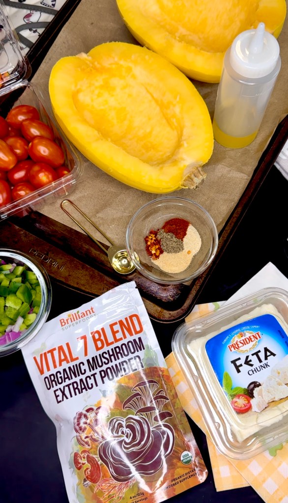 I am making the spaghetti squash feta tomato pasta recipe again today actually. I have some leftover grilled harissa chicken from another recipe I will be working on later this week, so that is what we will eat this feta tomato spaghetti squash with for dinner later. All of that to say, this is a versatile recipe for adding whatever protein your heart desires!